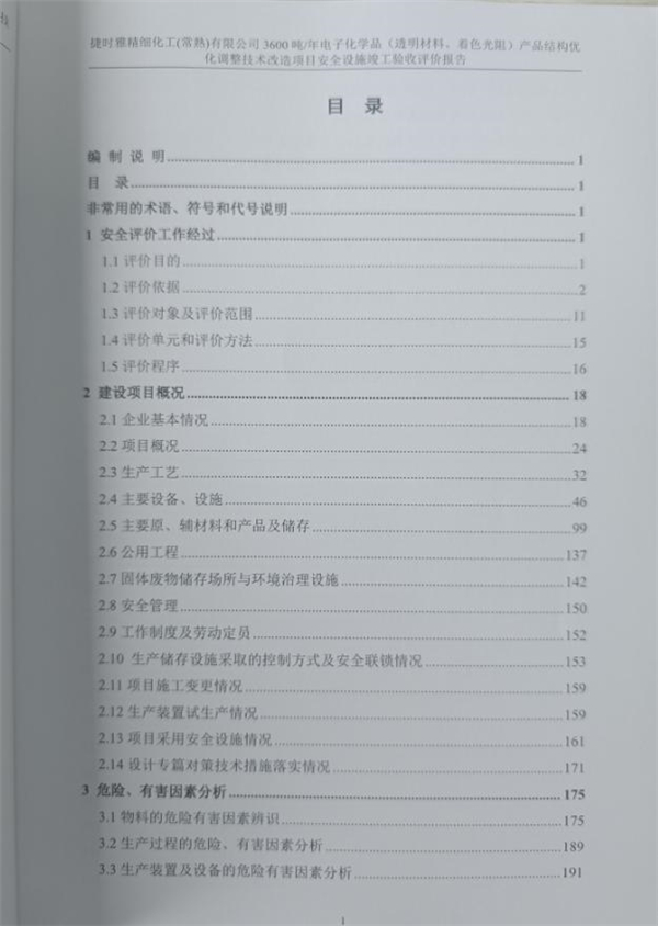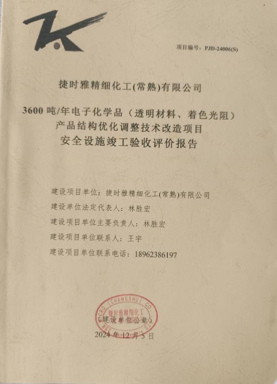 捷時雅精細化工(常熟)有限公司3600噸/年電子化學品(透明材料、著色光阻)產品結構優化調整技術改造項目安全設施竣工驗收評價報告