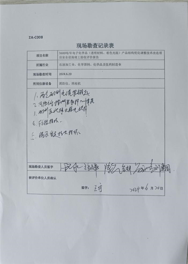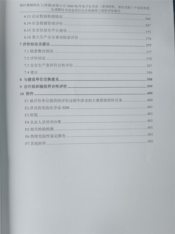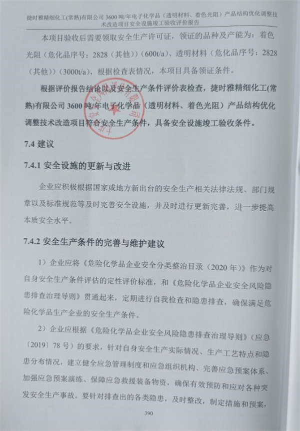根據評價報告結論以及安全生產條件評價表檢查,捷時雅精細化工(常熟)有限公司3600噸/年電子化學品(透明材料、著色光阻)產品結構優化調整技術改造項目符合安全生產條件,具備安全設施竣工驗收條件。 |